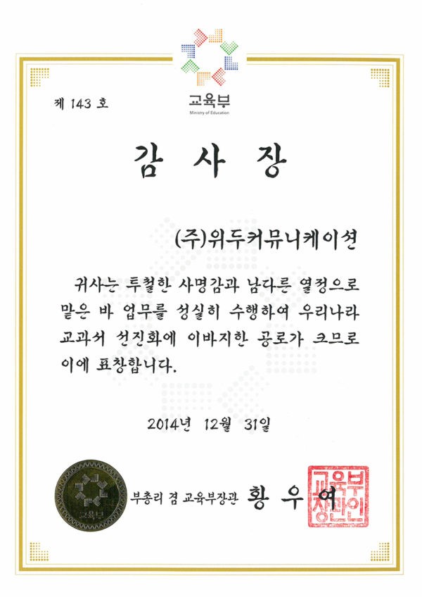 감사장 제 143호 페이지 정보 작성자 WeDu 댓글 0건 조회 6,364회 작성일 19-05-30 19:33 본문 2014-12-31 감사장 제 143호 교과서 선진화 부총리 겸 교육부장관 황우여 List Previous산업통상자원부 표창장 19.05.30 Next한국여성벤처협회 표창장 19.05.30