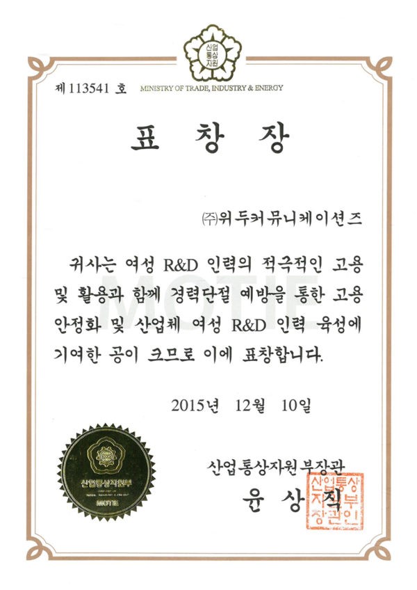 산업통상자원부 표창장 페이지 정보 작성자 WeDu 댓글 0건 조회 6,571회 작성일 19-05-30 19:34 본문 2015-12-10 표창장 제 113541호 여성 R&D 인력 고용 산업통상자원부장관 윤상직 List Previous서울클러스터 어워드 우수상 19.05.30 Next감사장 제 143호 19.05.30