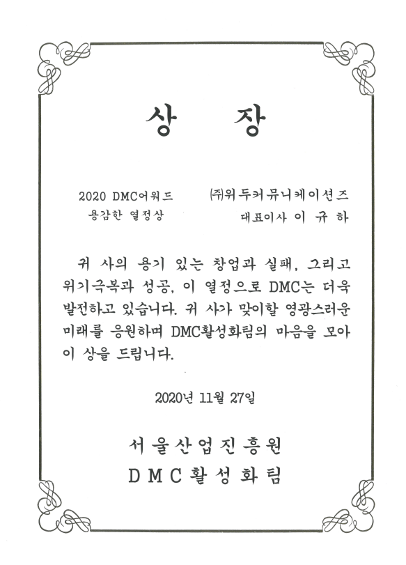 2020 서울산업진흥원 2020 DMC어워드 페이지 정보 작성자 WeDu 댓글 0건 조회 6,046회 작성일 21-12-31 12:57 본문 2020-11-27 2020 DMC어워드 용감한 열정상 서울산업진흥원 DMC활성화팀 List Previous2020 기술혁신 우수기업 21.12.31 Next2018 소년한국 우수 어린이 도서 19.05.30