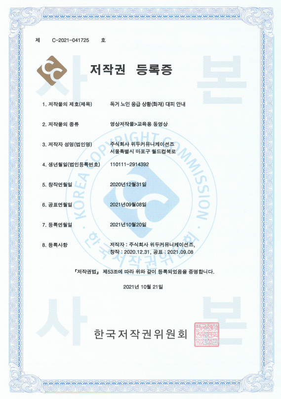 [한국/저작권] 독거 노인 응급 상황(화재) 대피 안내 페이지 정보 작성자 WeDu 댓글 0건 조회 6,820회 작성일 21-12-31 12:41 본문 2021-10-21 저작권 C-2021-041725 영상저작물>교육용 동영상 List Previous[한국/저작권] 장보기 인지훈련 게임 21.12.31 Next[한국/저작권] OLL KIDS/MATH 21.12.31